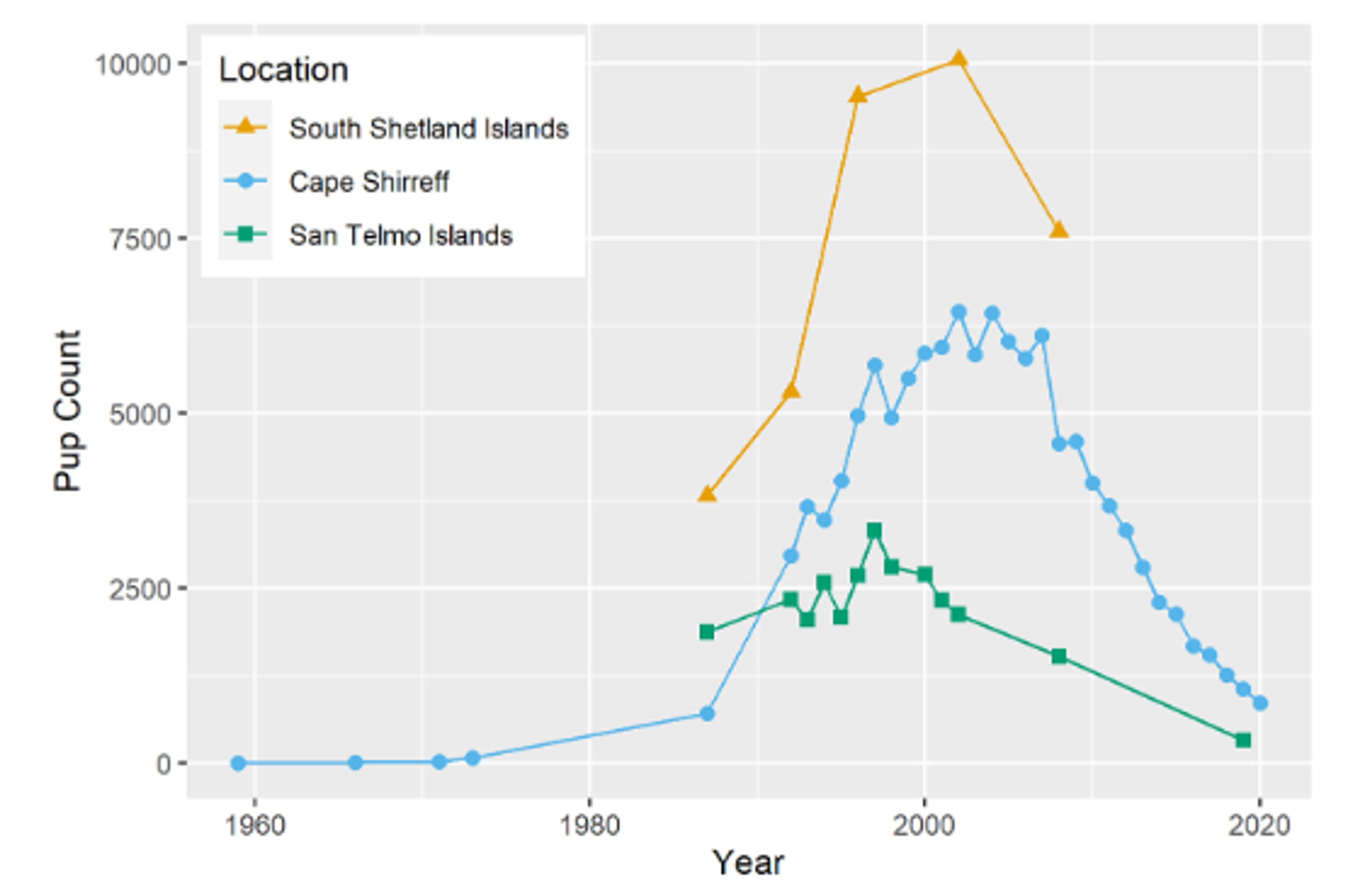 This graph shows Antarctic fur seal pup counts (living and dead) from 1959 to 2020 across South Shetland Islands breeding sites. Gold triangles represent the entire archipelago, blue circles show Cape Shirreff data, and green squares indicate San Telmo Islets counts. This six-decade dataset reveals dramatic population changes and highlights the South Shetland Islands' role as critical breeding habitat. The comprehensive survey data provides essential baseline information for understanding population dynamics and the current conservation crisis facing this genetically distinct breeding stock.Key Findings